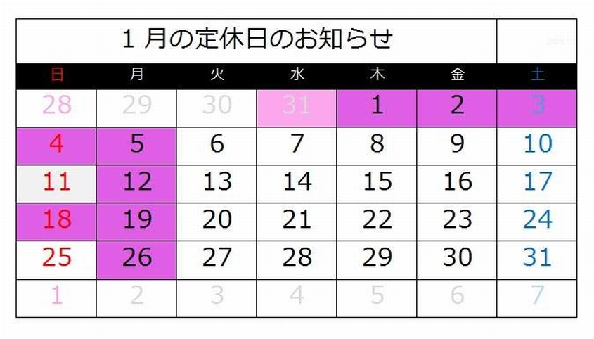 1日~5日(正月休み)12日(月曜日)18日(第3日曜日)19日(月曜日)26日(月曜日)